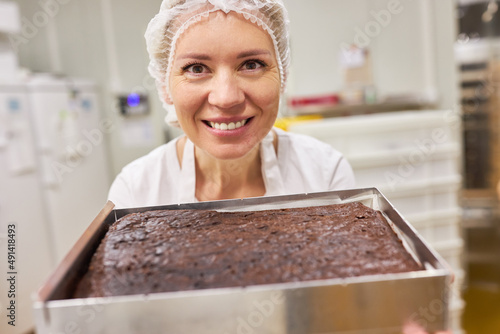 Bäckerin zeigt stolz einen frischen Schokoladenkuchen
