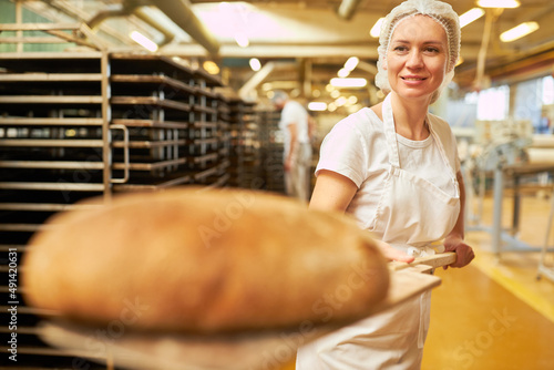 Junge Frau als Bäckerin mit Brot Laib auf einem Brotschieber