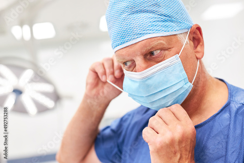 Oberarzt als Chirurg mit Haube setzt seinen Mundschutz auf