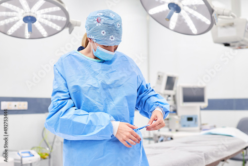Ärztin als Chirurgin mit Mundschutz zieht sich den Kittel an