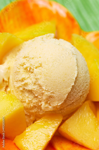 Orangensorbet als Fruchteis mit Scheibe Orange