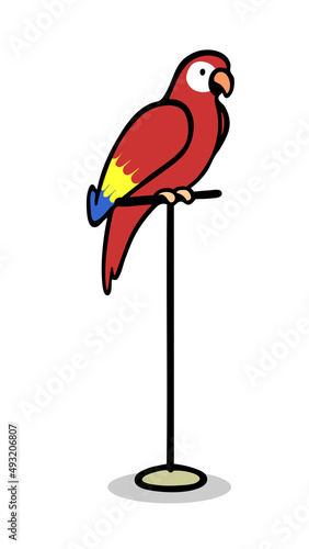 Hellroter Ara Papagei als Cartoon Tier sitzt auf Sitzstange