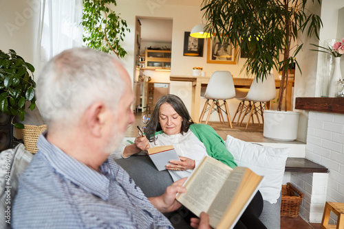 Zufriedener Senior im Wohnzimmer beim Buch lesen