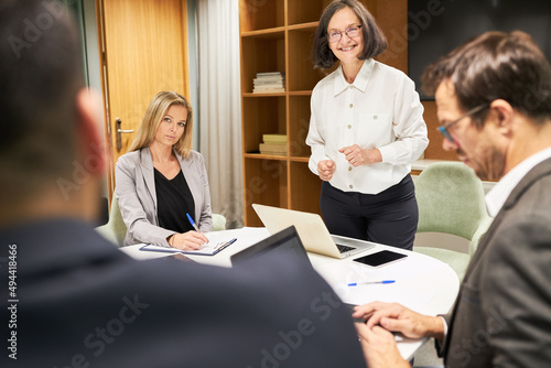 Ältere Business Frau als Chefin zusammen mit ihrem Team