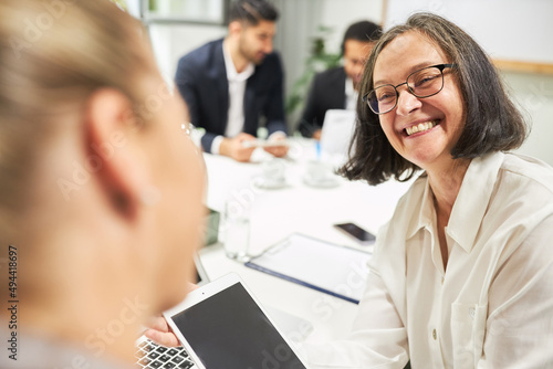 Zwei Frauen im kreativen IT Team arbeiten am Laptop PC