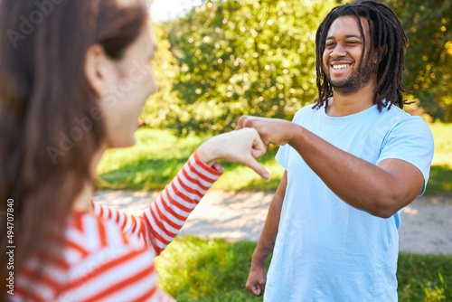 Freunde begrüßen sich cool und lässig mit Fist Bump