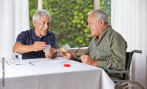 Pflegekraft mit Tablet und eine Gruppe Senioren