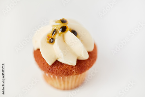 Draufsicht auf Cupcake mit Maracujacreme und Topping
