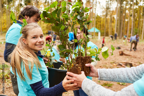Ehrenamtliche Helfer und Förster mit jungen Bäumen