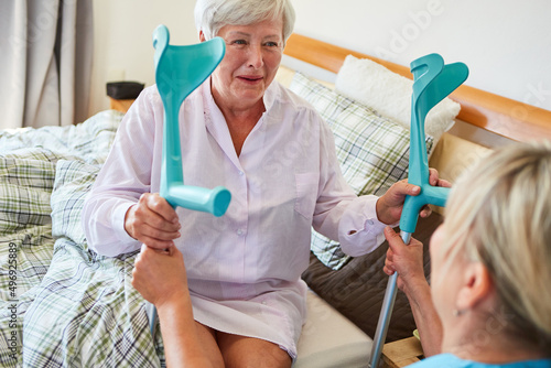 A nurse brings crutches to the bed of a senior citizen