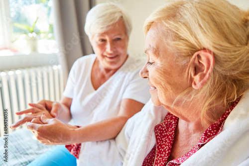 Physiotherapeutin massiert Hand von Seniorin als Akupressur