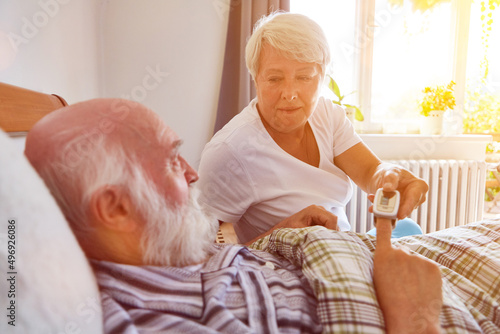 Geriatric nurse measures pulse of senior in bed with pulse oximeter