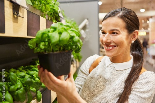 Kundin in der Kräuter Abteilung mit Basilikum in der Hand