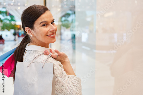 Happy woman with shopping bag on shopping trip