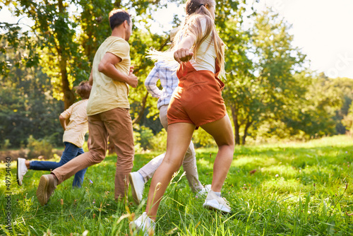 Fröhliche junge Frau und ihre Freunde Hand in Hand