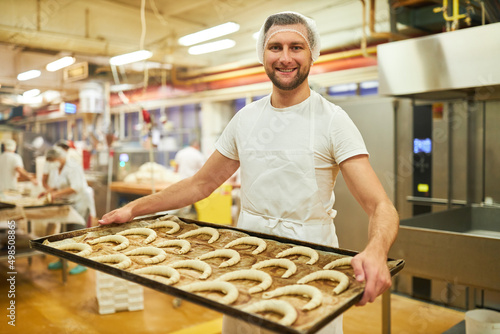 Junger Mann als Bäcker in der Ausbildung beim Brot backen
