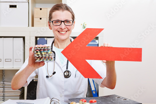 Frau zeigt mit Pfeil auf viele Tabletten