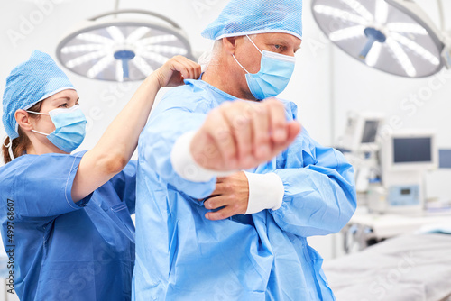 Chirurgen ziehen sich Einmalhandschuhe vor der Operation
