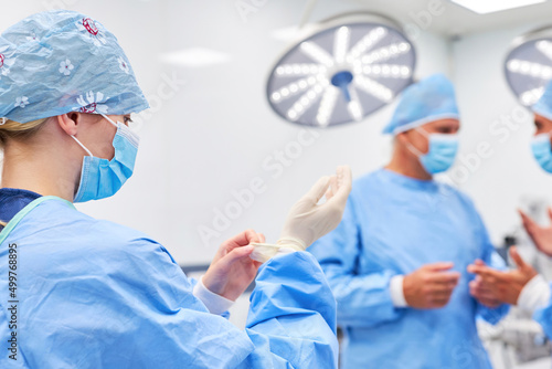 Young woman as a surgeon puts on disposable gloves