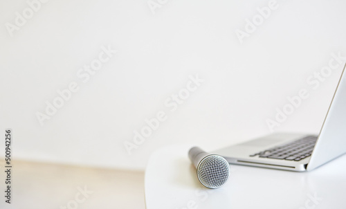 Redner mit Mikrofon hält Vortrag und Präsentation