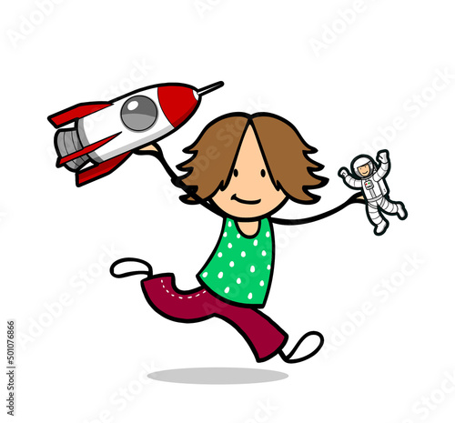 Spielendes Mädchen mit Astronaut und Raumschiff