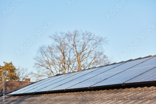 Sonne scheint auf Photovoltaik Anlage auf Dach von Haus