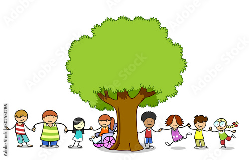 Children hold hands on meadow with tree in summer
