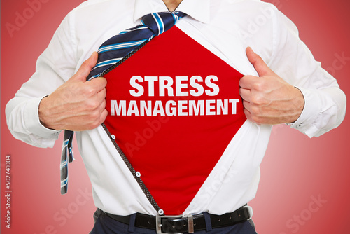 Geschäftsmann zeigt Schriftzug Stress Management unter Hemd