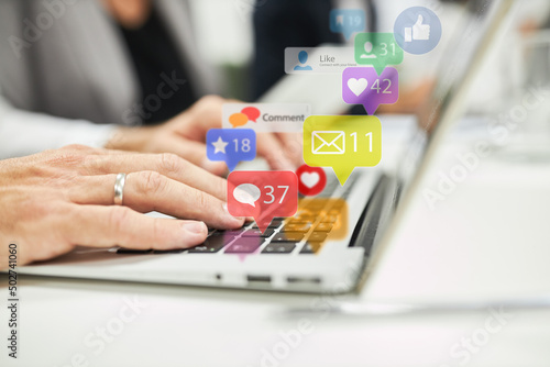 Hände tippen auf Touchscreen mit vielen Benachrichtigungen