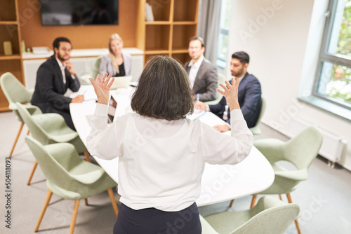 Professional meeting with attentive business people in office setting discussing ideas and raising hand for interaction