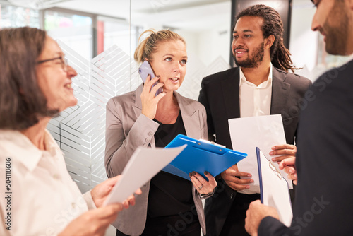 Gruppe Geschäftsleute mit Smartphone und Checkliste