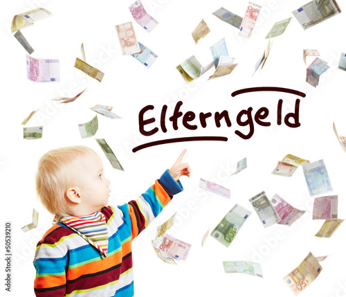 Kind zeigt auf Elterngeld mit Geldscheinen