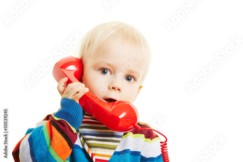 Kind telefoniert mit rotem Telefonhörer