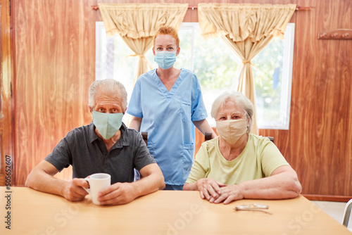 Pflegekraft mit Mundschutz spielt mit Senioren Domino