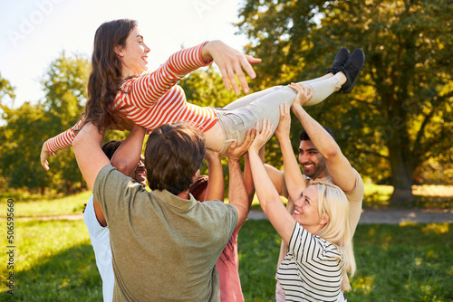 Gruppe junger Leute hebt eine Frau in die Höhe
