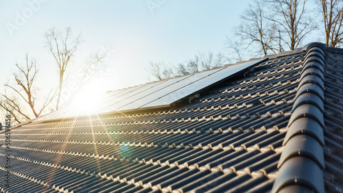 Sun shines over roof with solar panels for renewable energy