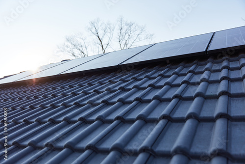 Sonne scheint auf Photovoltaik Anlage auf Dach von Haus