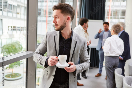 Manager stands by the window and drinks a cup of coffee