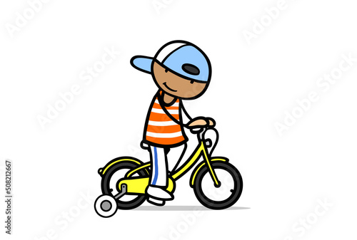 Cartoon Junge lernt Fahrrad fahren mit Stützrädern