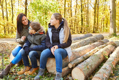 Familie mit Mutter und zwei Kindern sitzt im Wald