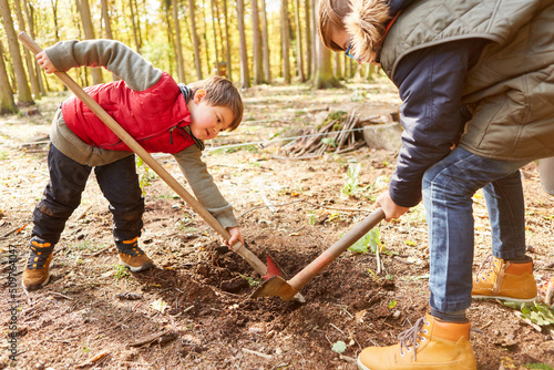 Zwei Jungen buddeln ein Loch im Wald für die Aufforstung