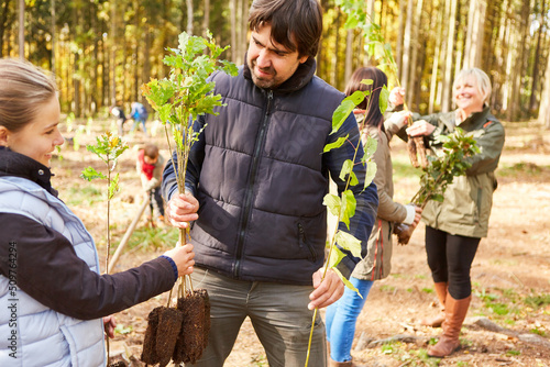 Förster und Kind mit Setzlingen zur Aufforstung im Wald
