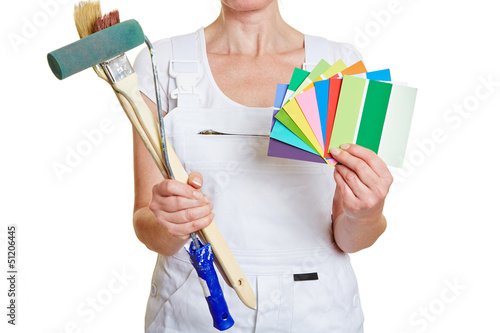 Frau in Malerkleidung mit Farbfächer und Pinsel