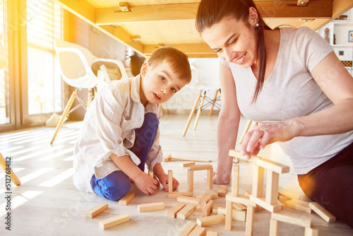 Mutter und Kind stapeln gemeinsam Bauklötze aus Holz