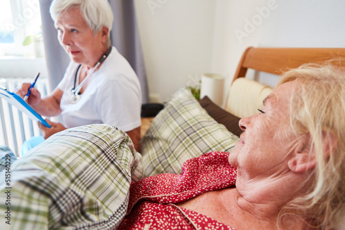 Elderly as a patient in bed and a doctor with patient files
