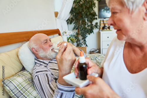 Altenpflegerin bringt Medikamente ans Bett von Seniorin