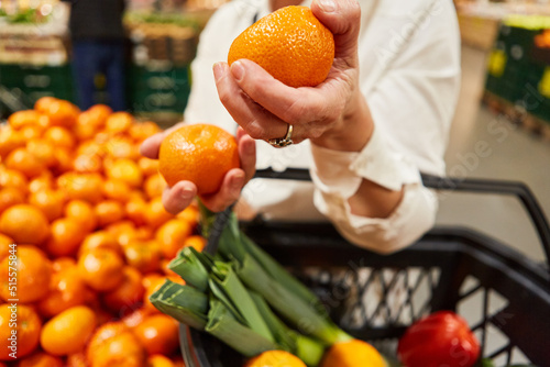 Kundin am Obststand beim Einkaufen von Mandarinen
