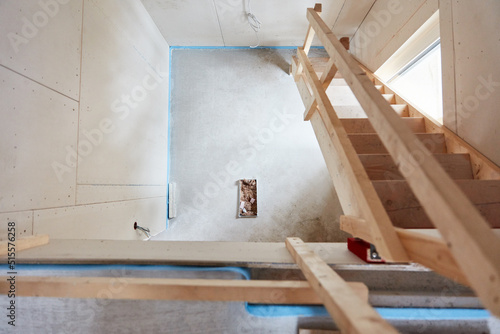 Provisorische Bautreppe aus Holz bei Hausbau im Flur