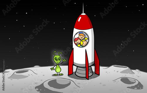 Außerirdischer begrüßt Kinder bei Landung im Raumschiff