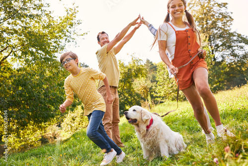 Familie und Kinder mit Hund haben Spaß beim Laufen